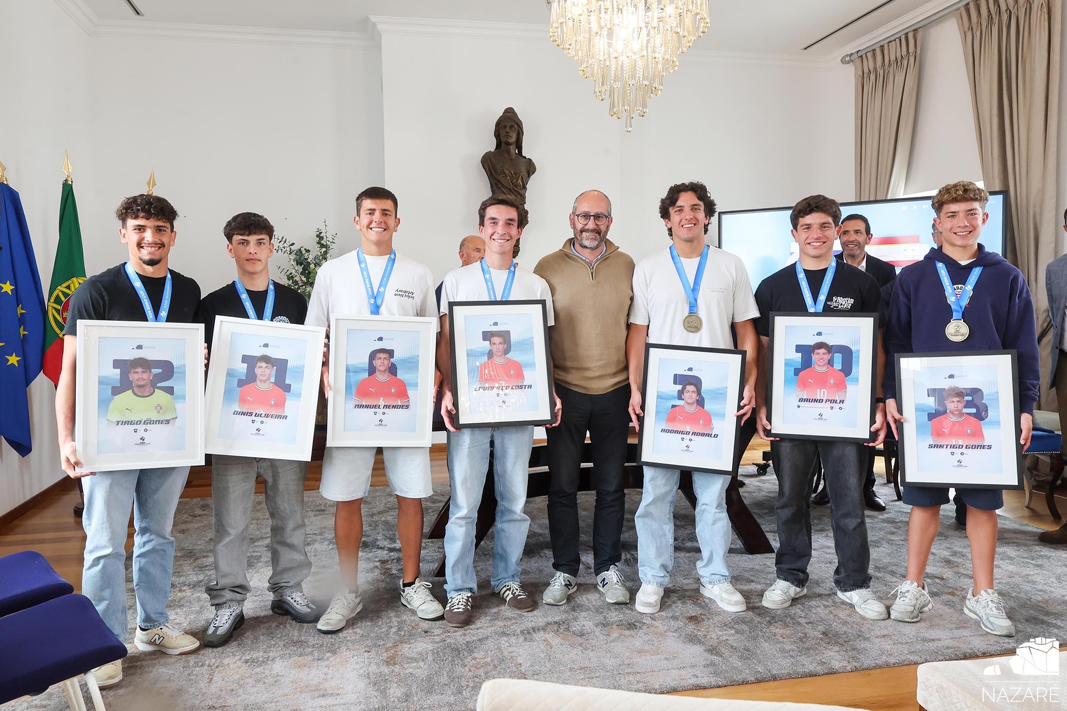 Foram distinguidos Tiago Gomes, Bruno Pola, Lourenço Costa, Dinis Oliveira, Rodrigo Robalo, Manuel Mendes e Santiago Gomes, protagonistas de uma conquista histórica para Portugal e motivo de grande orgulho para a Nazaré.