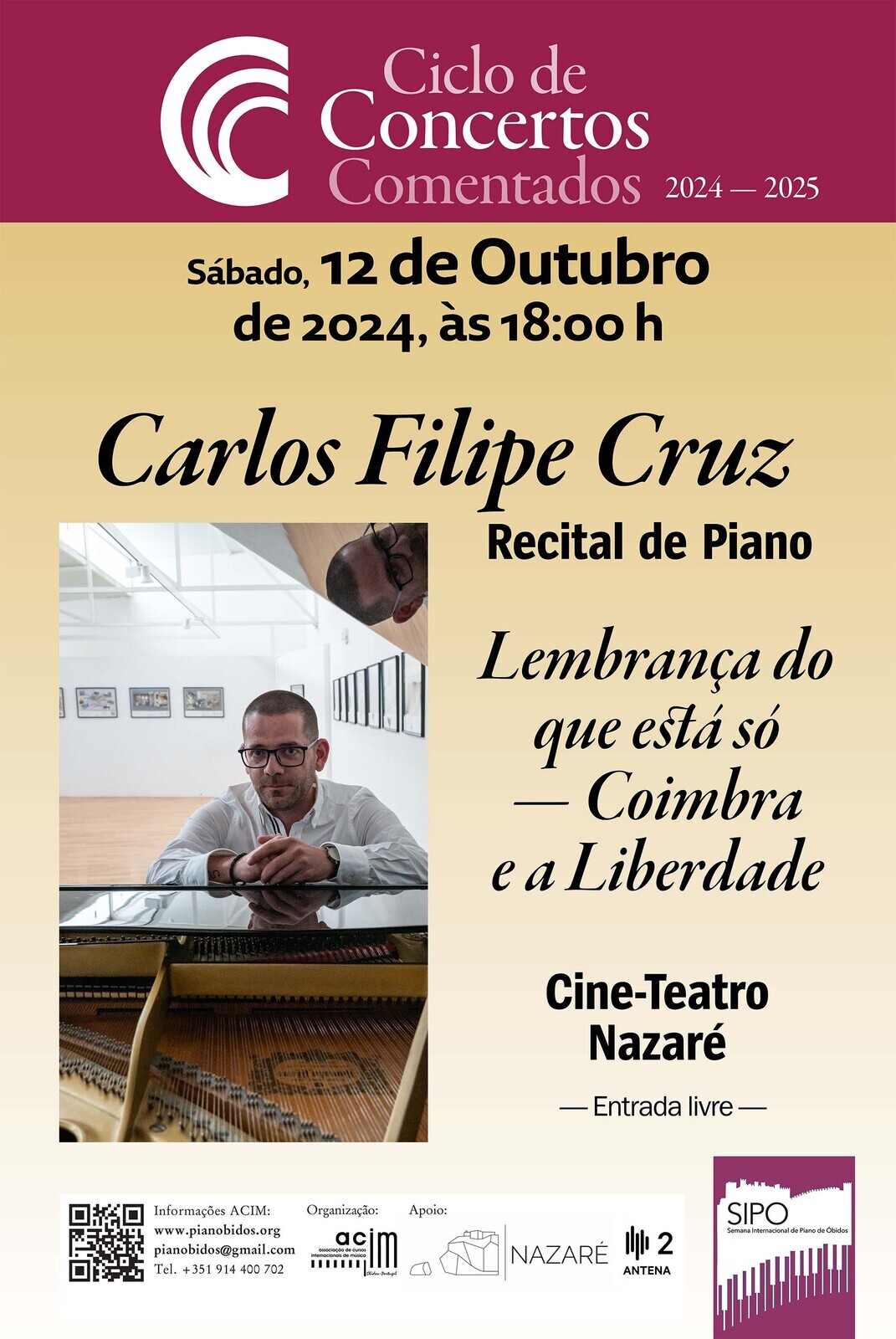 A temporada 2024-2025 do Ciclo de Concertos Comentados regressará à Nazaré em outubro. O primeiro de três apresentações, no palco do cineteatro, será o Recital de Piano, por Carlos Filipe Cruz, no próximo dia 12 de outubro, às 18h00. Marque a data na sua agenda.