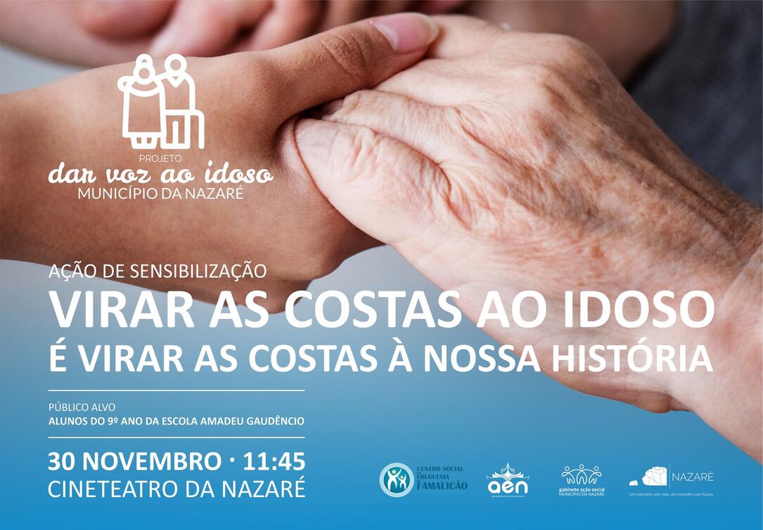 O Município da Nazaré irá realizar uma Ação de Sensibilização dsobre envelhecimento, no âmbito do Projeto Municipal "Dar Voz ao Idoso", no próximo dia 30 de novembro, no cineteatro, às 11h45, dirigida aos alunos do 9º ano da EBS Amadeu Gaudêncio.