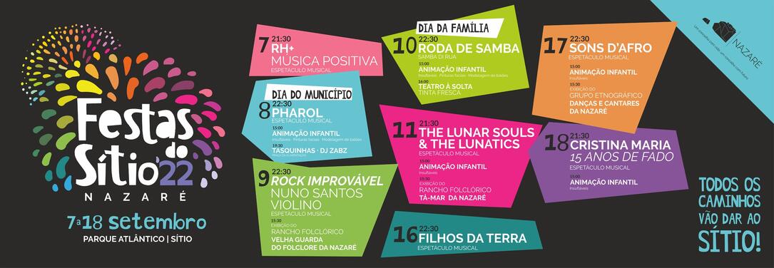 Os Rh+ - Música Positiva abrem o cartaz das festas no dia 7 de setembro (21h30), seguindo-se a atuação de Pharol no dia do Município (8/9, 22h30); Rock Improvável com Nuno Santos Violino (9/9, 22h30); Roda de Samba (10/9, 22h30); The Lunar Souls & The Lunatics (11/9, 21h30); Filhos da Terra (16/9; 22h30); Sons D’Afro (17/9, 22h30) e Cristina Maria com o espetáculo “15 anos de Fado” encerrará o palco das festas no dia 18 de setembro, às 21h30.