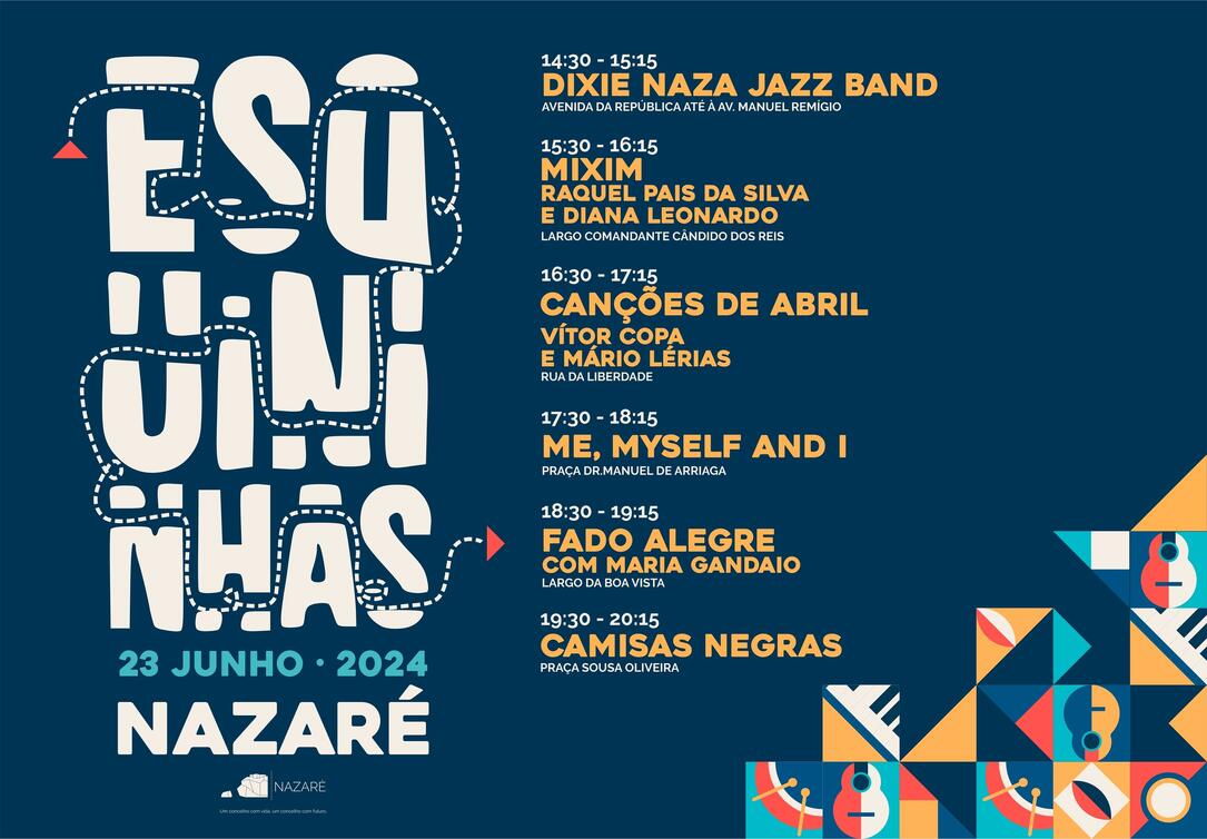 O evento de música “Esquininhas” andará pelas principais artérias da vila da Nazaré no dia 23, dividido em seis momentos, que serão dinamizados por bandas e artistas locais. A iniciativa começará com os Dixie Jazz Band, entre a Av. da República e a Av. Manuel Remigio (14h30); prosseguindo com Mixim – Raquel Pais da Silva e Diana Leonardo, no Largo Comandante Cândido dos Reis (15h30-16h15); As canções de abril, com Vitor Copa e Mário Lérias (16h30-17h15) na Rua da Liberdade; Me Myself and I (17h30-18h15) na Praça Dr. Manuel de Arriaga; Fado Alegria, com Maria Gandaio (18h30-19h15) no Largo da Boa Vista; e Camisas Negras (19h30-20h15) na Praça Sousa Oliveira.